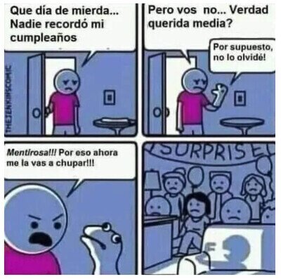 #29 #29 mydickinyourmouth dijo: Dios, y la peña diciendo que si a tí te gustaría que se te cagaran en la comida, que si vaya mierda de padre... JODER, ES UN PUTO CHISTE. Igual os confundisteis de página, mirar en ascodevida.com a ver si es ahí donde queríais entrar... de verdad que a veces flipo con la peña.Completamente de acuerdo, la gente se debe pensar que esto es un periódico digital y que las viñetas son noticias reales porque si no no entiendo a qué viene esto de decir cosas como que el padre (ficticio) no es responsable y no debería cagarse en el almuerzo de su hijo (ficticio).